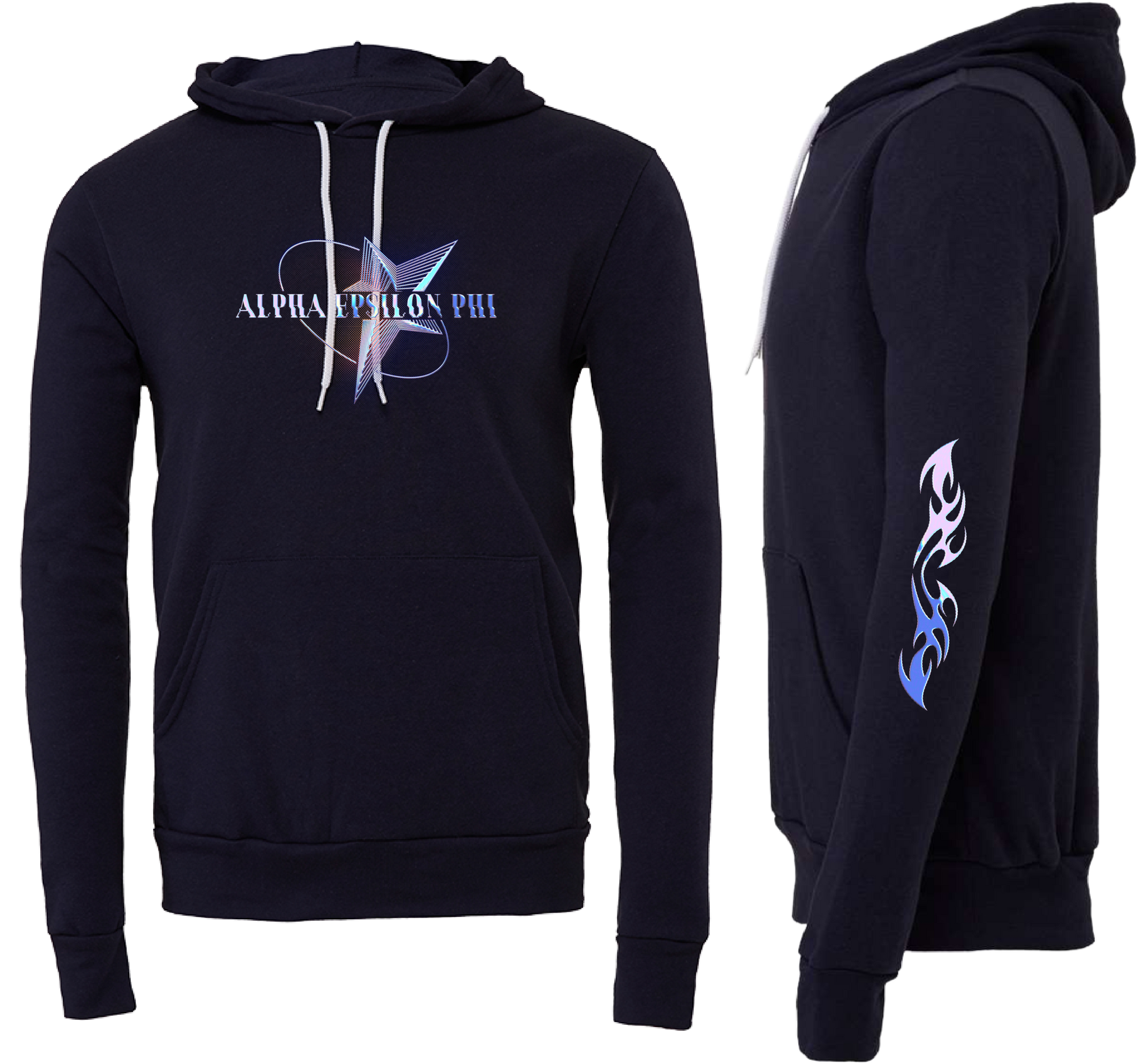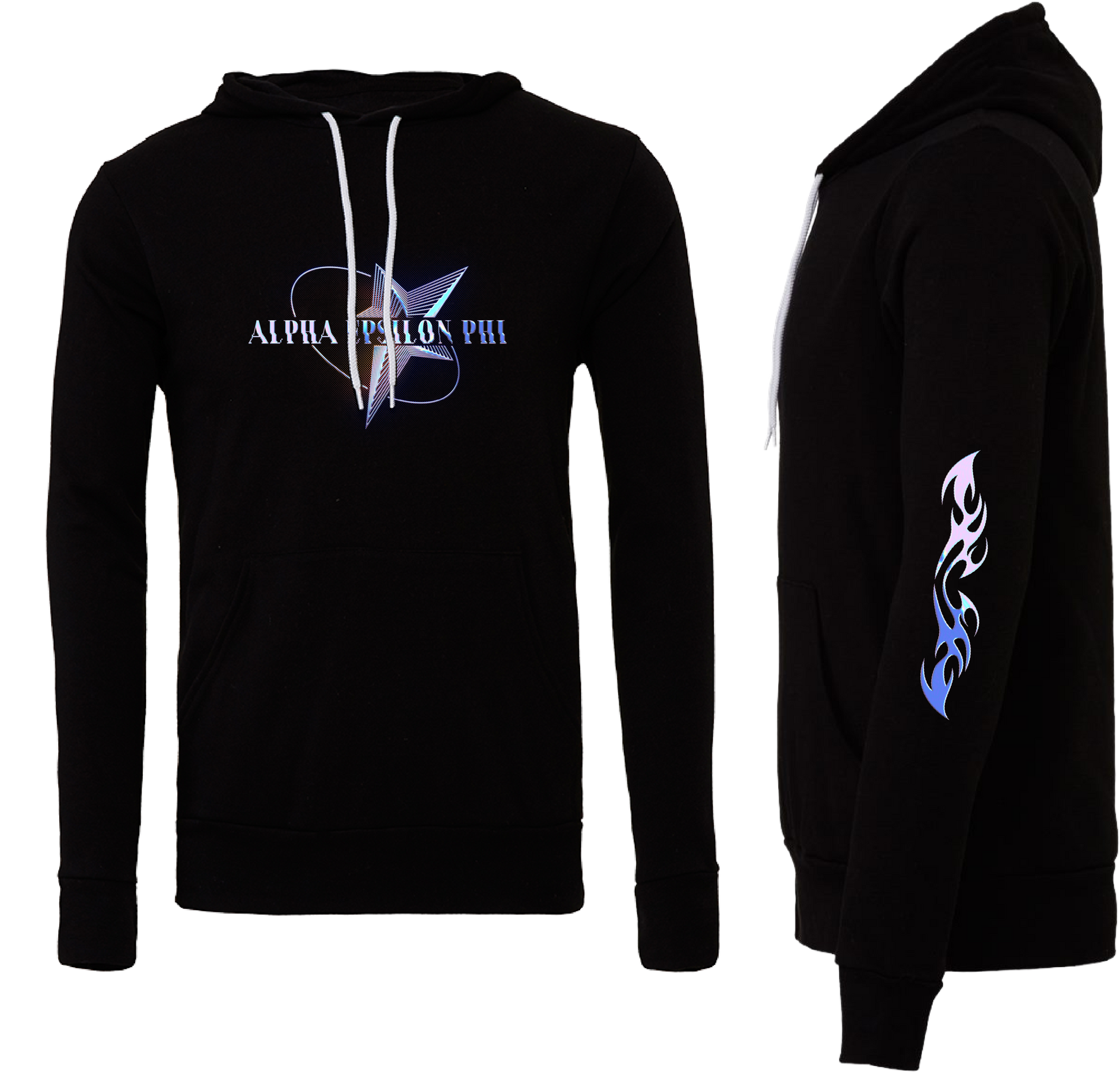 The Alpha Epsilon Phi Pink Chrome Graphic Hoodie combines dark cotton comfort with sophisticated design. It features a starry pink chrome graphic on the front and a neo-tribal detail on the left sleeve’s elbow, offering a refined and stylish look perfect for elevating your casual wardrobe.