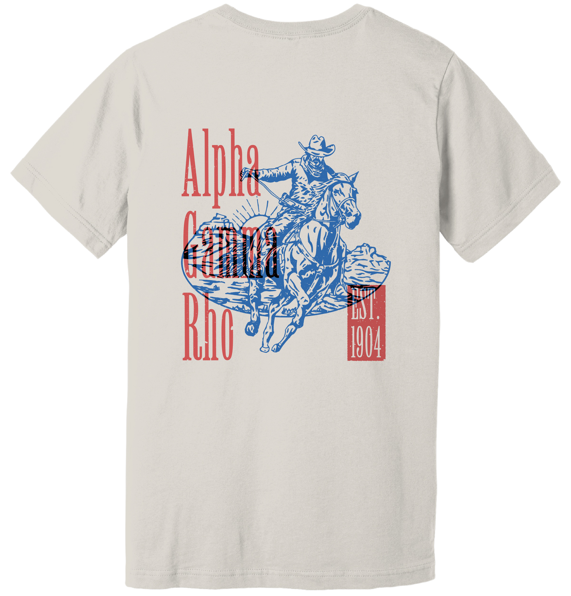 The Alpha Gamma Rho Cowboy Graphic T-Shirt offers a sophisticated blend of collegiate pride and Western-inspired design. Made with quality materials for lasting comfort, this shirt features a tasteful cowboy graphic that embodies both elegance and a subtle rugged edge.