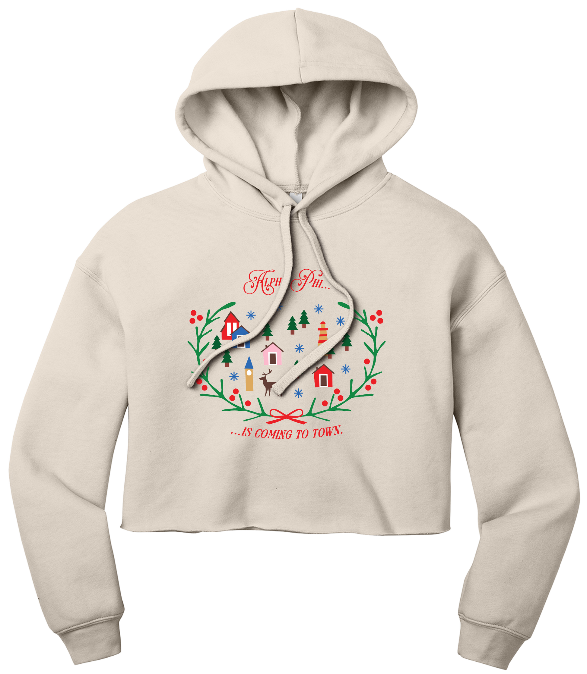 This holiday-ready embroidered fleece cropped hoodie featuring Alpha Phi. Warm, comfortable, and perfect for festive celebrations with your sisters.