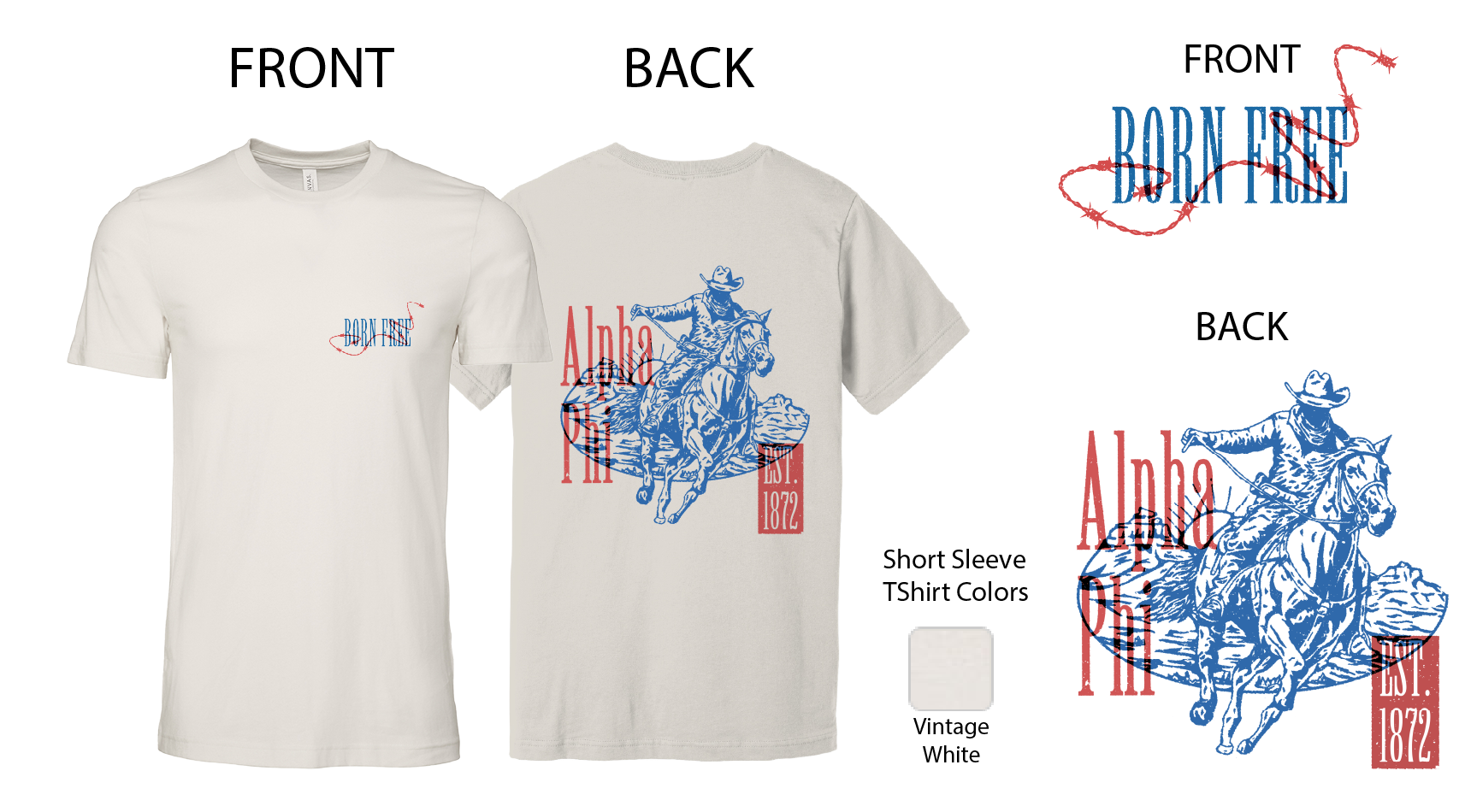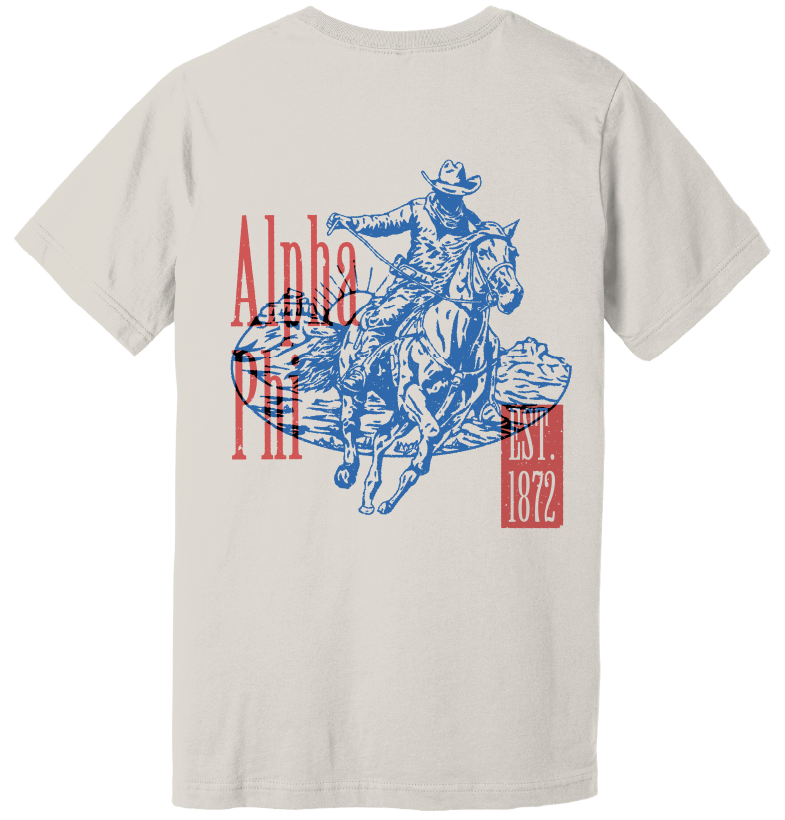The Alpha Phi Cowboy Graphic T-Shirt offers a sophisticated blend of collegiate pride and Western-inspired design. Made with quality materials for lasting comfort, this shirt features a tasteful cowboy graphic that embodies both elegance and a subtle rugged edge.