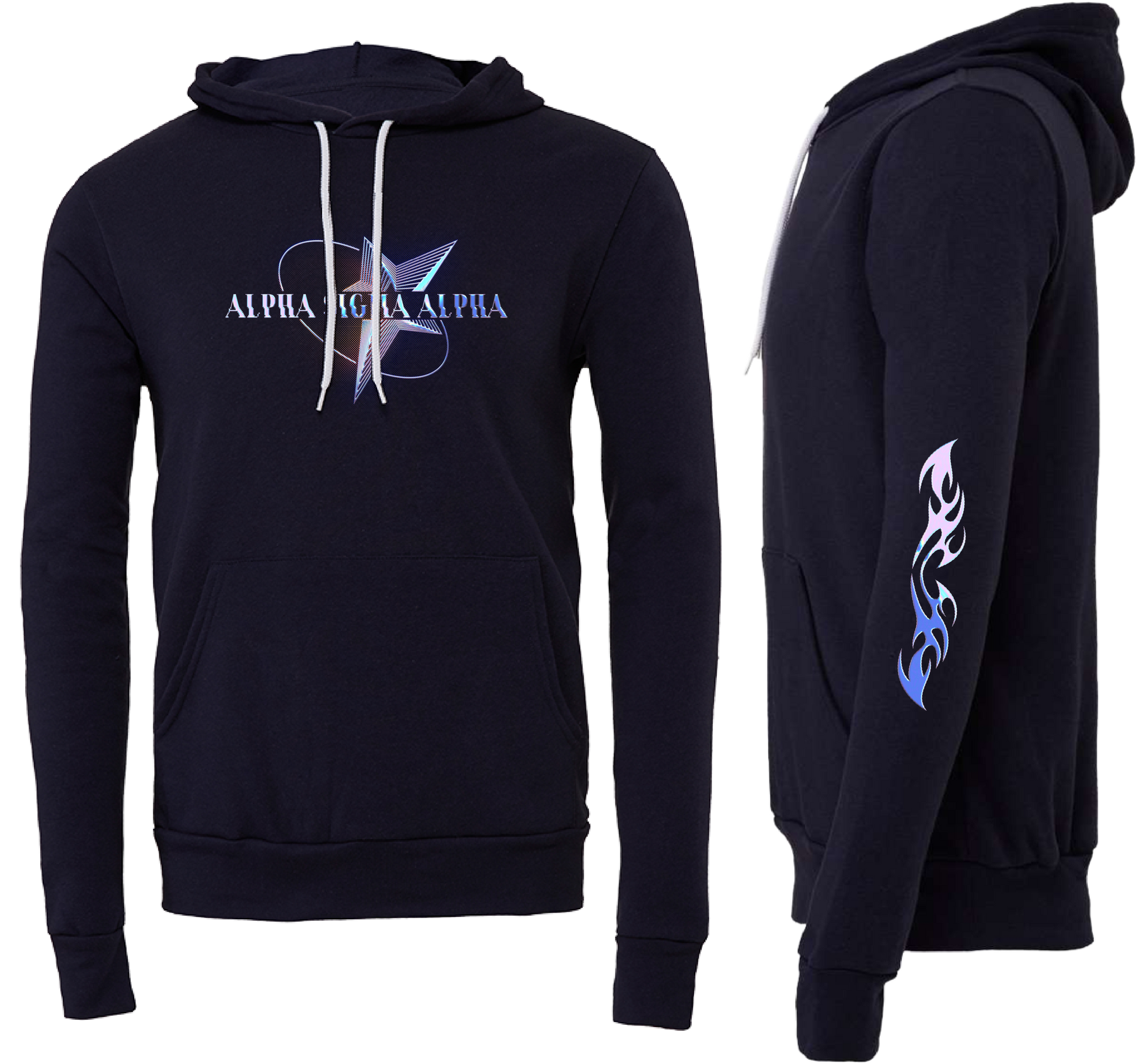 The Alpha Sigma Alpha Pink Chrome Graphic Hoodie combines dark cotton comfort with sophisticated design. It features a starry pink chrome graphic on the front and a neo-tribal detail on the left sleeve’s elbow, offering a refined and stylish look perfect for elevating your casual wardrobe.