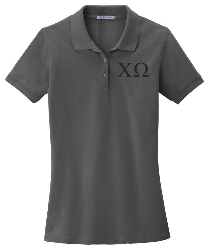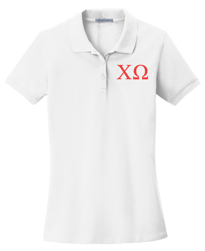 Look great everyday in an embroidered Chi Omega ladies' polo shirt.