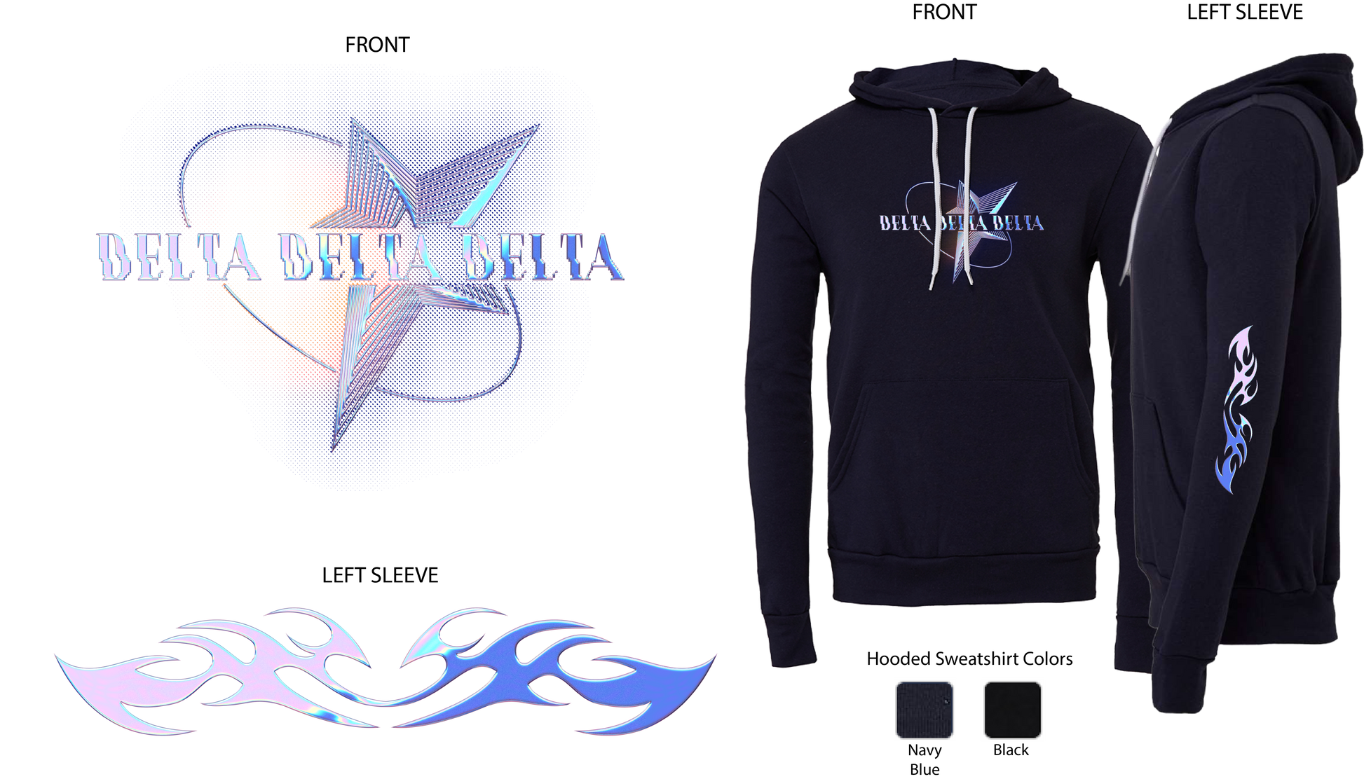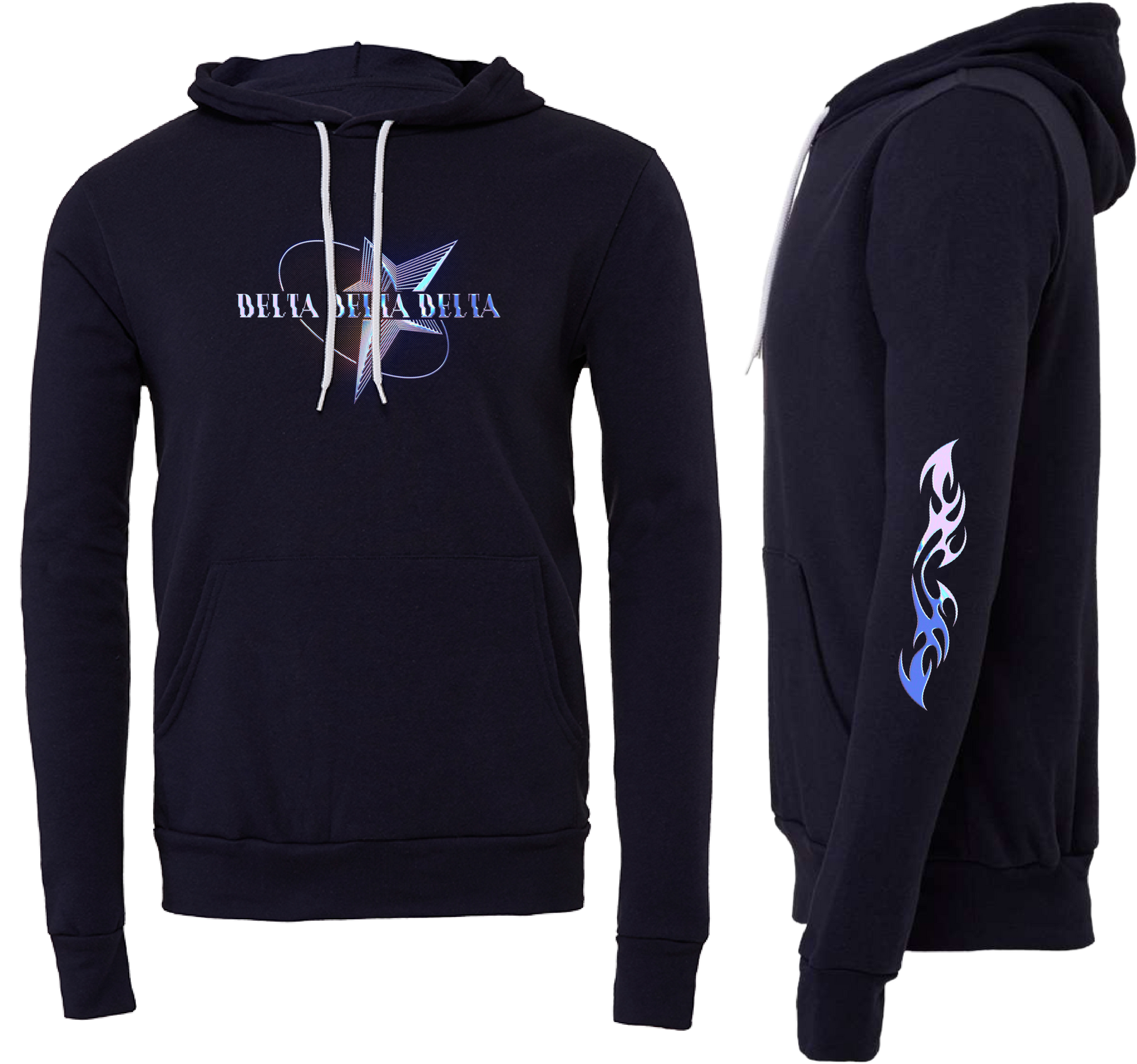 The Delta Delta Delta Pink Chrome Graphic Hoodie combines dark cotton comfort with sophisticated design. It features a starry pink chrome graphic on the front and a neo-tribal detail on the left sleeve’s elbow, offering a refined and stylish look perfect for elevating your casual wardrobe.