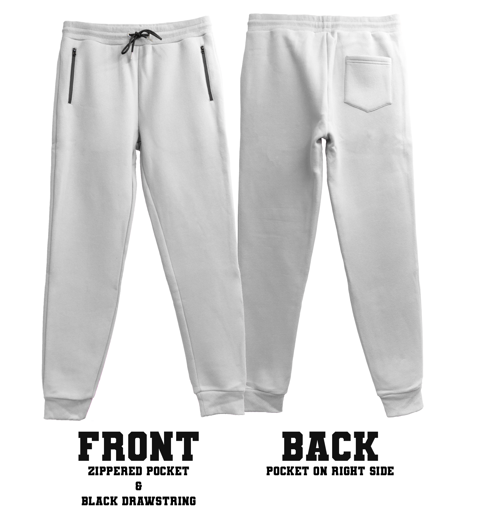 All of the sweatpants have a black drawstring and black-zippered front pockets. There is also a single pocket on the back of the pants.