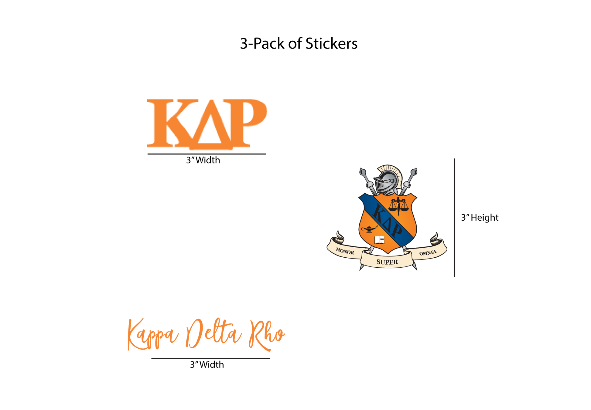 Decorate you laptop, water bottle, or anything else with these durable Kappa Delta Rho stickers. You get one of each of the 3" designs!