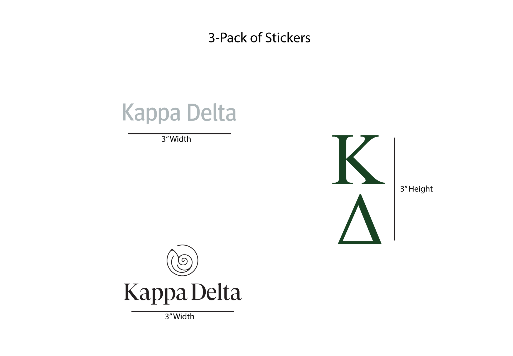Decorate you laptop, water bottle, or anything else with these durable Kappa Delta stickers. You get one of each of the 3" designs!