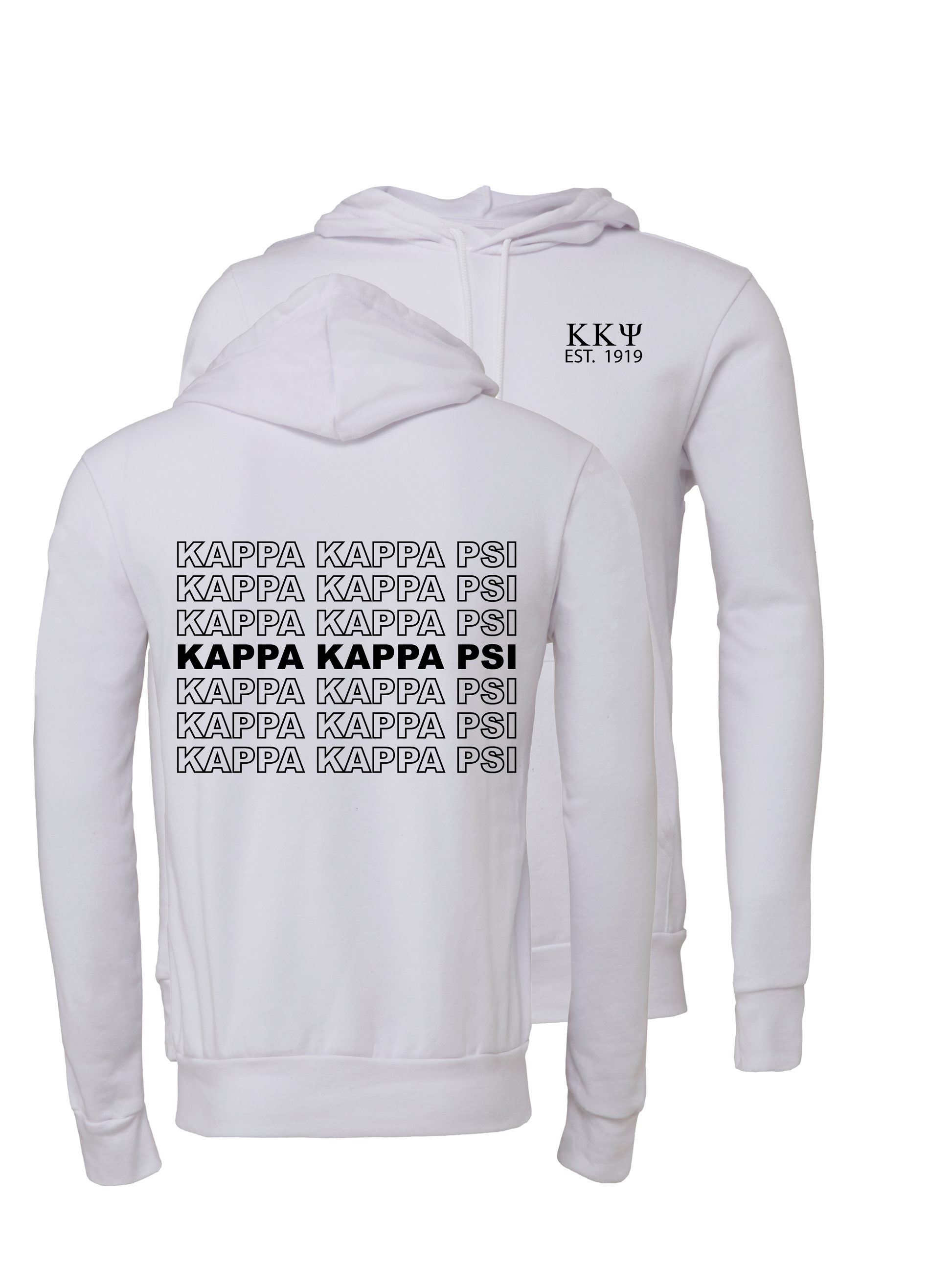 Have fun showing off your Kappa Kappa Psi membership with a hoodie with your organization's letters and established year on the front and repeating name on the back.