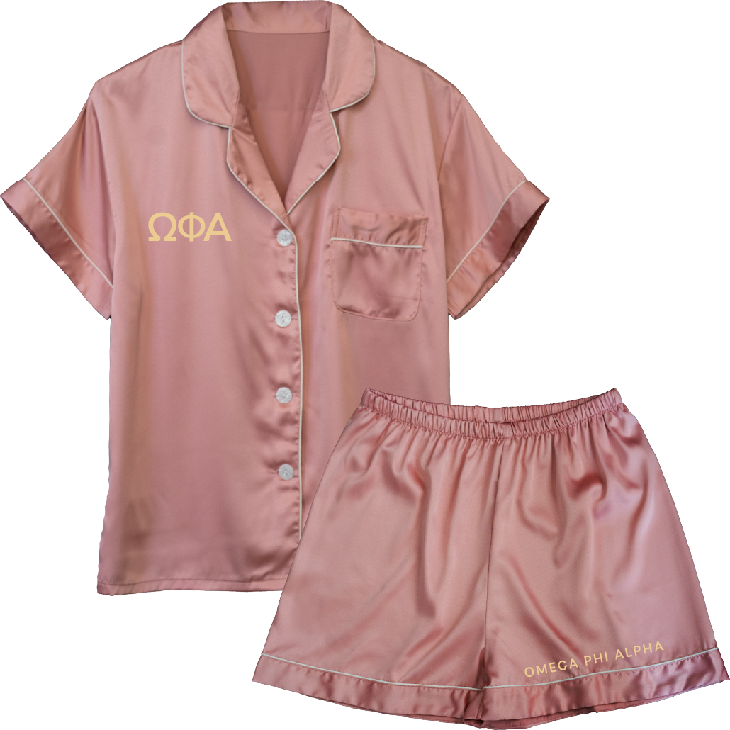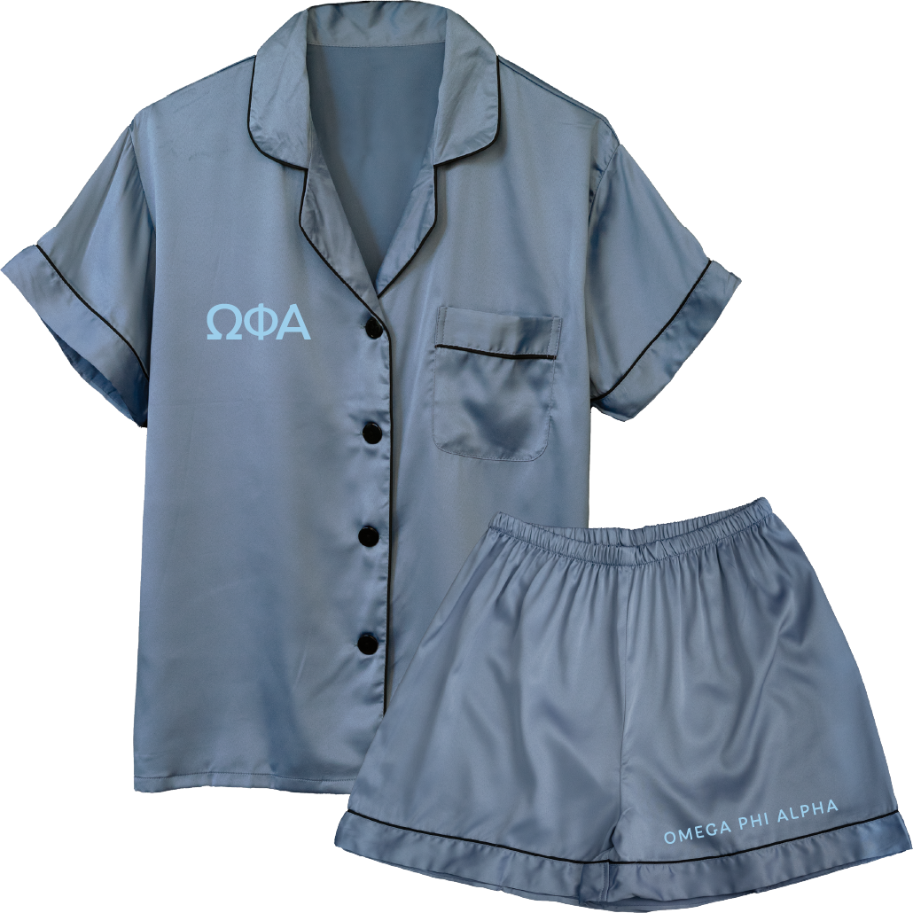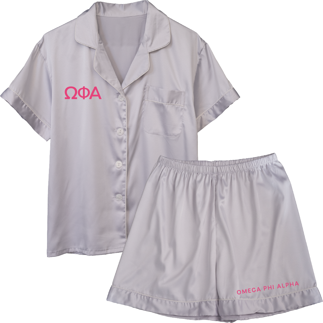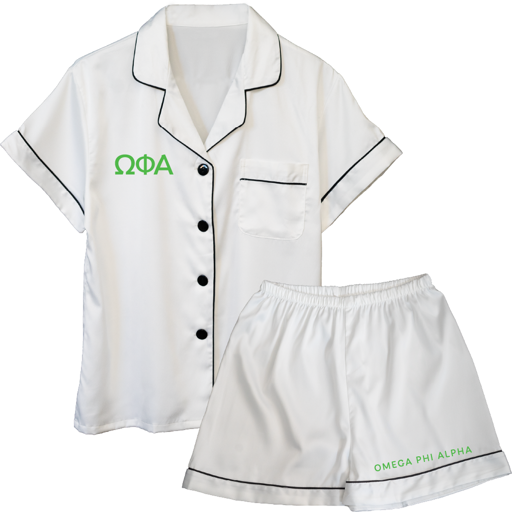 Sleep well in your Omega Phi Alpha pajama set. These shirt and shorts set are embroidered with your organization's letters and name. And, since they are made from satin material, you are sure to be cozy whenever you wear them.