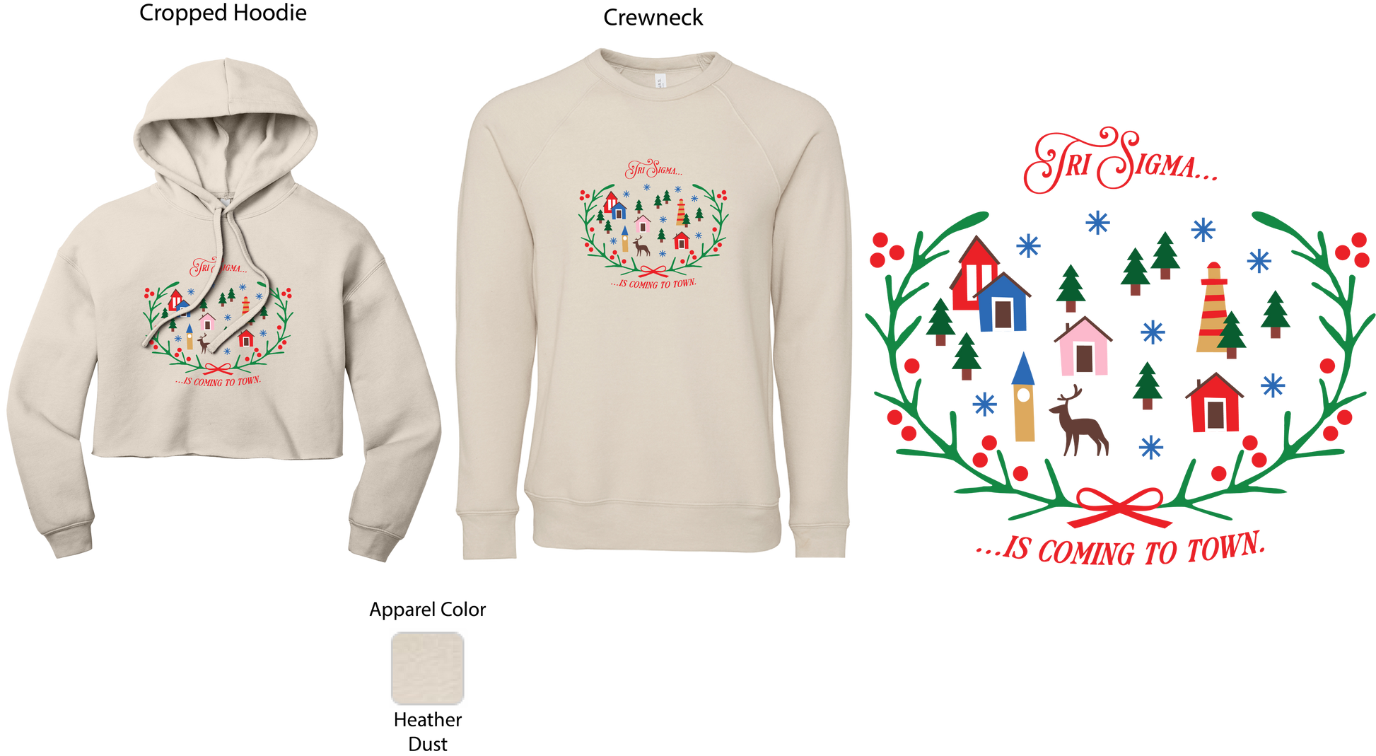This holiday-ready embroidered fleece crewneck featuring Tri Sigma. Warm, comfortable, and perfect for festive celebrations with your sisters.